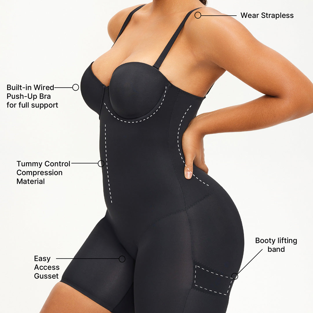 Meet your new favorite shapewear bodysuit. This Push Up Bra + Bodysuit Shorts will have all your curves looking smooth and snatched under any outfit. It has a built in underwire bra that supports the girls and detachable straps for versatile outfits. The double layer compression material flattens the tummy and has a booty lifting design. Wear it strapless, see-through straps, halter, or cris-cross.