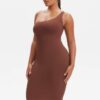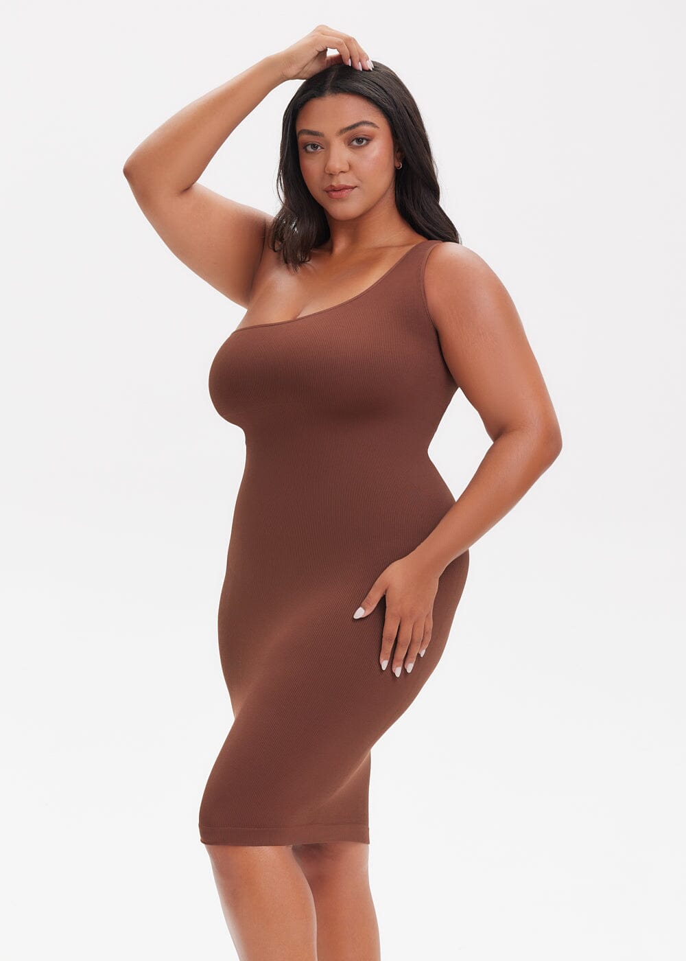 Introducing our Shapewear Dress One-Shoulder Strap with a built-in shapewear panel, designed to shape your curves with a 360 degree compression material in the abdominal. It features a one-shoulder strap slanted neck style to show off your curves. It can be worn braless and has removable pads, this dress is perfect for any occasion, adding a touch of elegance to your wardrobe. Experience the comfort and confidence that comes with our Shapewear Dress One-Shoulder Strap – order now and discover a new level of style and functionality in your wardrobe!