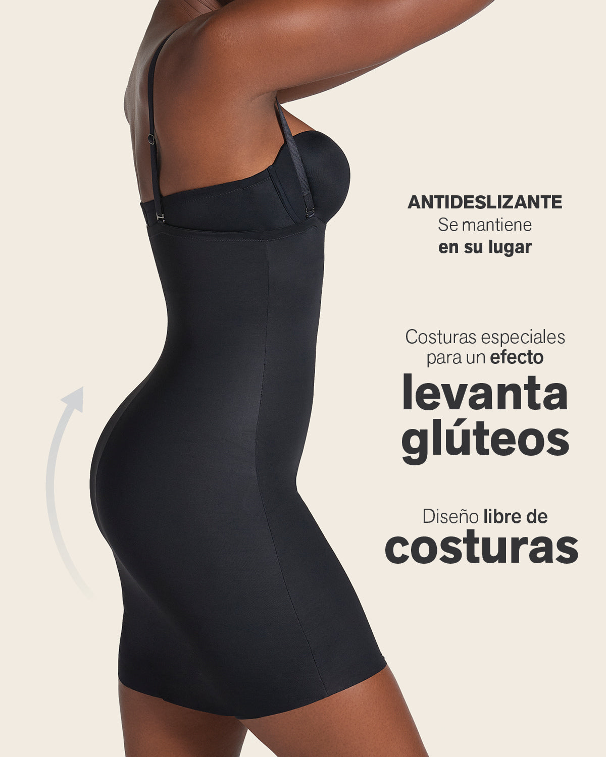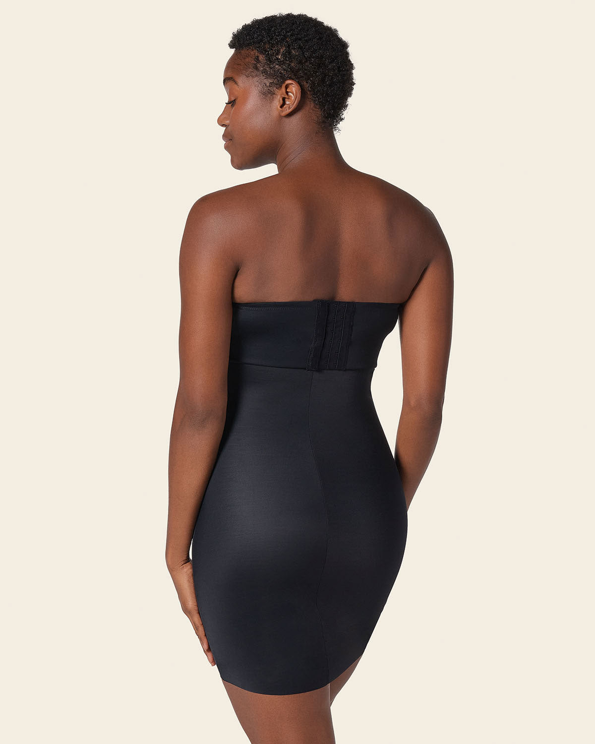 This innovative, totally unique shaping skort slip is made of our signature DuraFitĀ® fabric for firm compression to sculpt your mid-to-lower tummy. It has inner shorts for moderate compression to shape your thighs, prevent thigh rub, and give your butt a little lift. The open bust design lets you wear your own bra. An anti-slip grip lining keeps this shaper from riding up or rolling down. This innovative design is ultra-modern, combining comfort with shape to help you look and feel your absolute best.